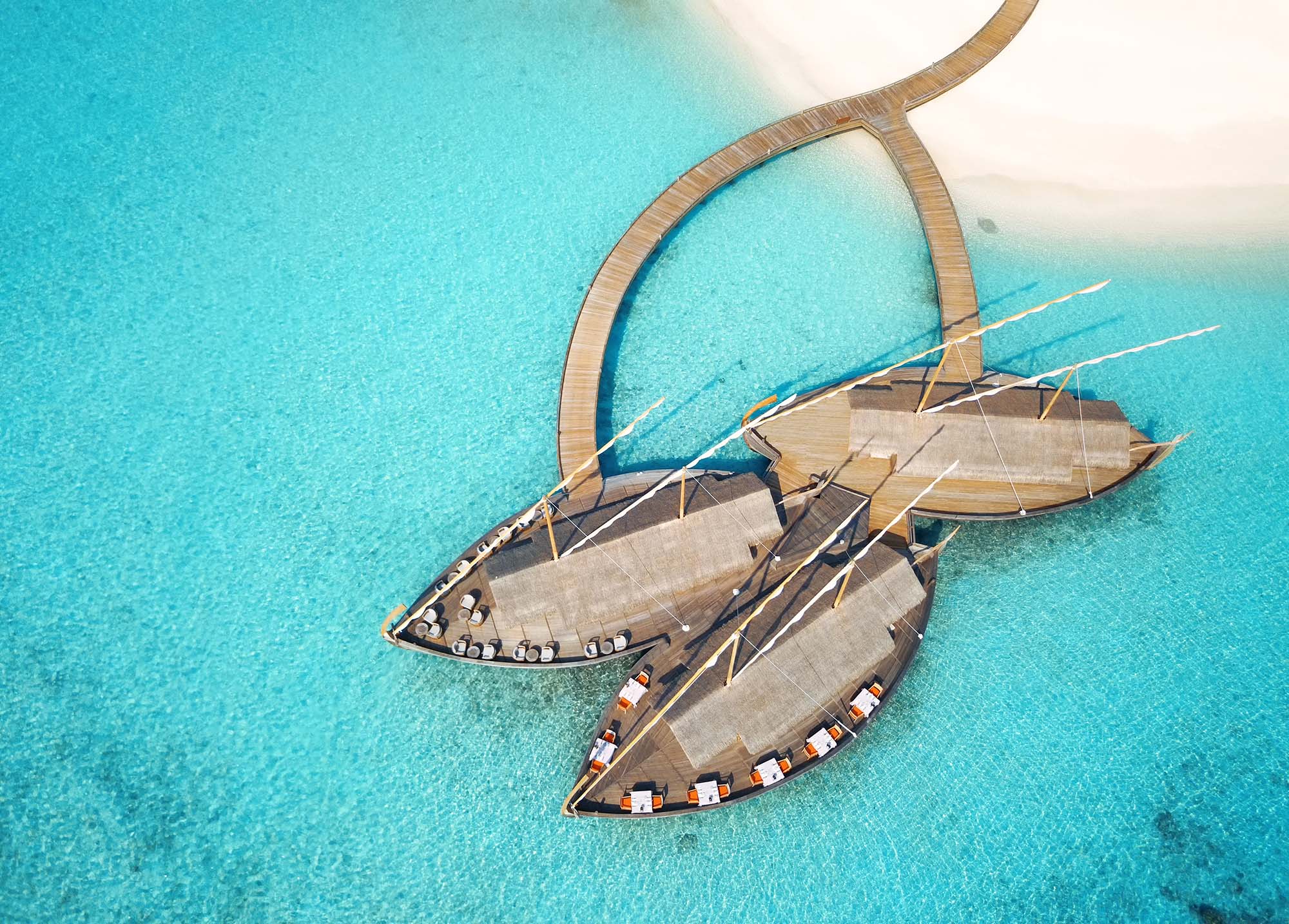 “Ba’theli”, der er øens signaturrestaurant, tilbyder maldivisk fine dining i tre dhoni-både, som flyder på vandet.