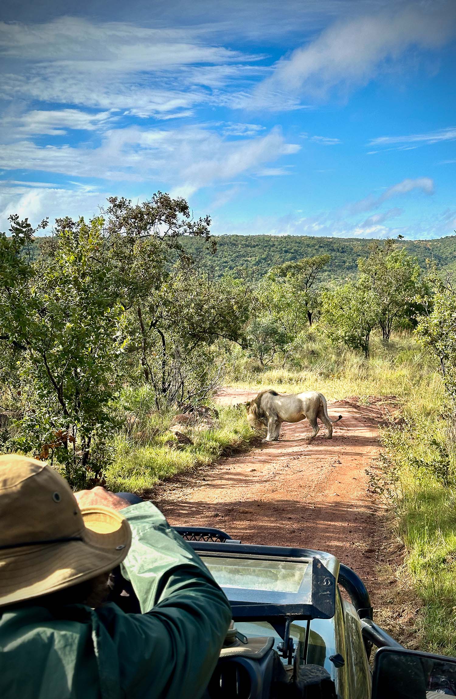 Jeg kan virkelig mærke adrenalinen pumpe, da en hanløve går over vejen tre meter fra os. Vi sidder i en helt åben bil og landskabet strækker sig ud foran os, mens vores guide afdæmpet fortæller om den enlige hanløve. En gren knækker under dens poter, da den søger ind i buskadset, og vi kører videre.